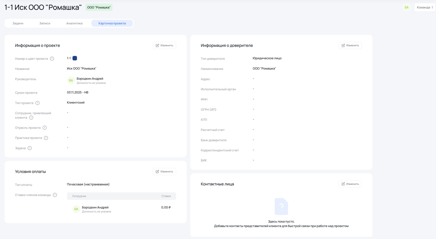 💡 Совет: Карточку клиента можно заполнить позже, но рекомендуем перед началом полноценной работы указать реквизиты — они будут автоматически подгружаться в карточки проектов с этим клиентом и в выставляемые по ним документы.