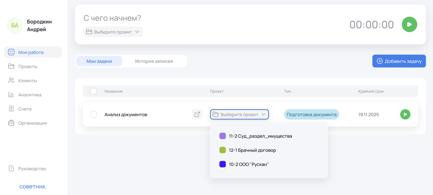 💡 Совет: Можно запустить таймер вообще без привязки к задаче — просто нажмите "Старт". Детали добавите позже в разделе "История записей", когда остановите таймер.