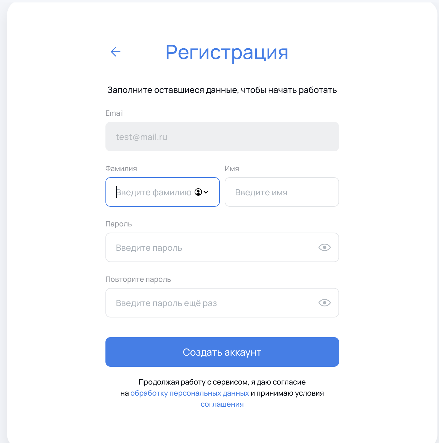 1. Кликните на аватар/инициалы в правом верхнем углу экрана 2. В "Карточке сотрудника" заполните основную информацию: