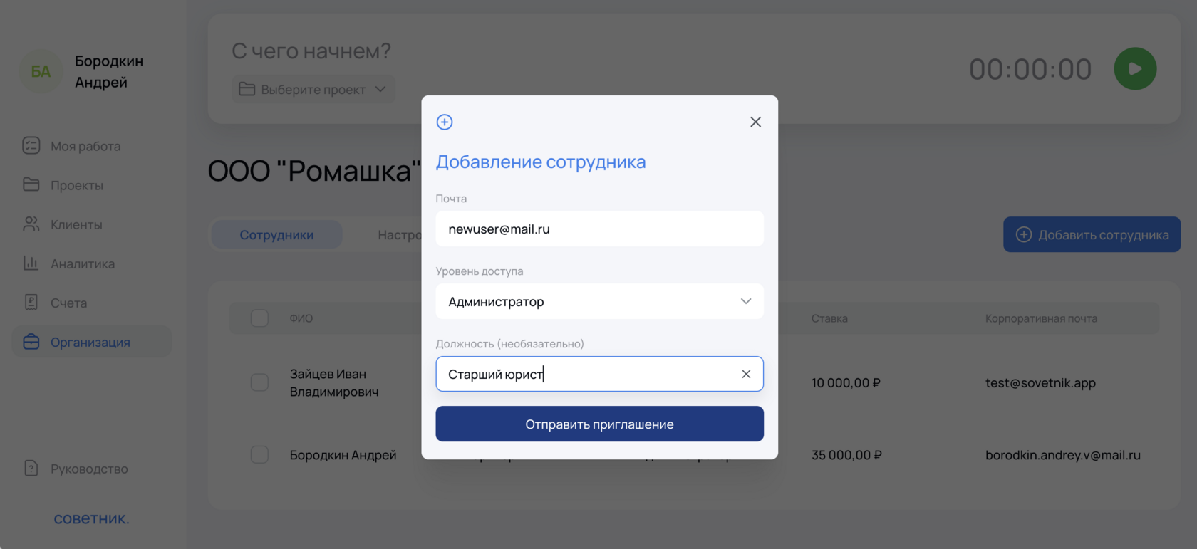 Готово! Теперь вы настроили Советник и готовы к полноценной работе. Создавайте задачи, учитывайте время, выставляйте счета и отчёты и собирайте данные для аналитики эффективности работы компании.