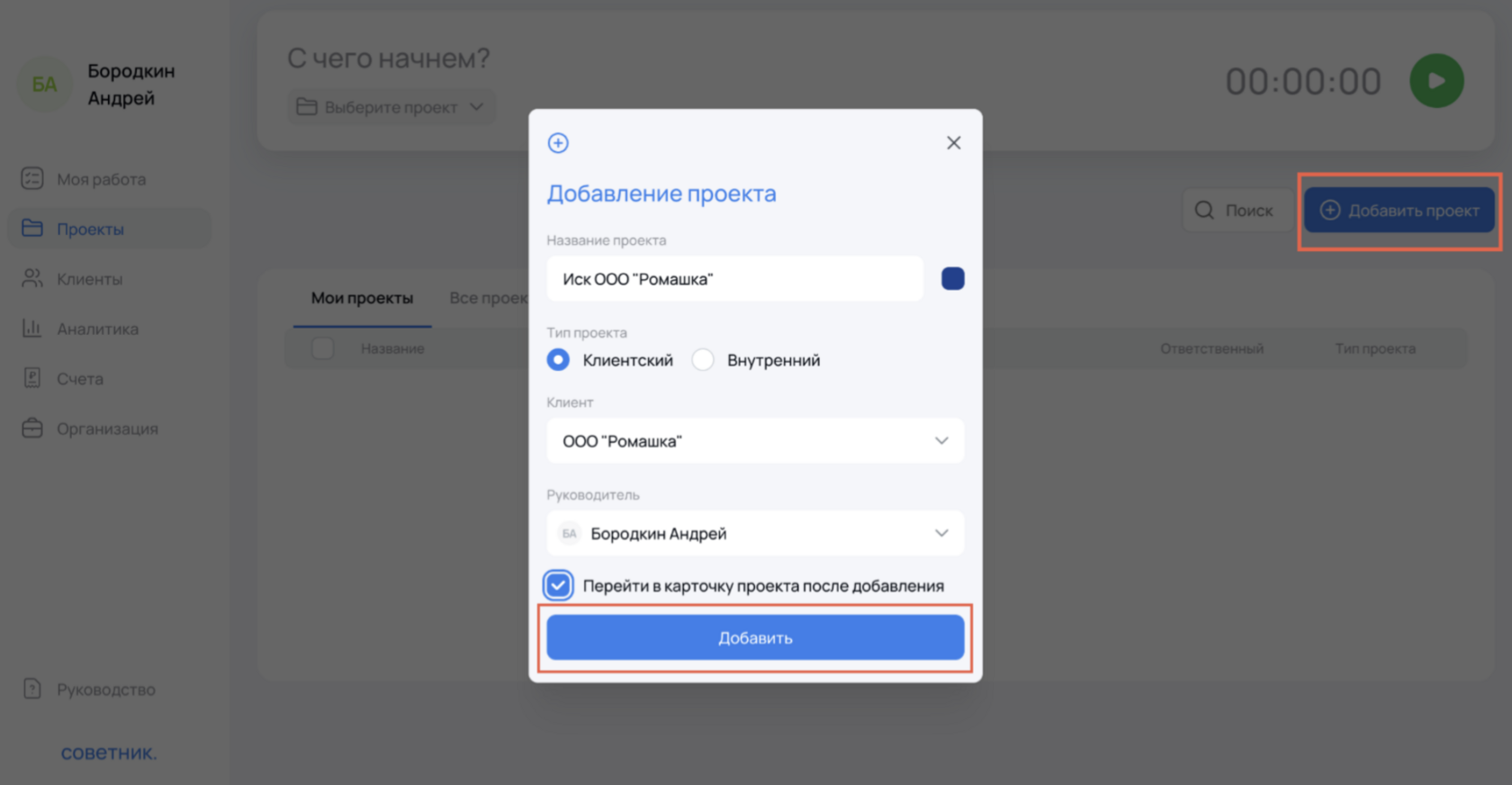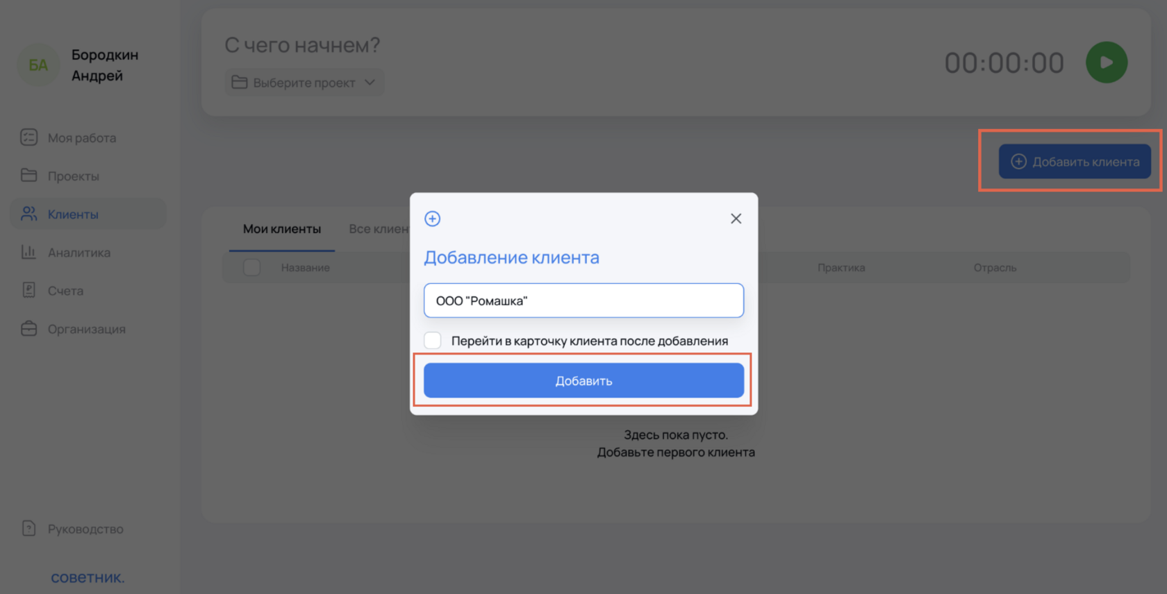 Прежде чем работать над проектами, добавьте клиента в систему.