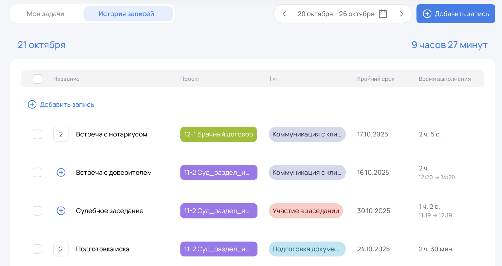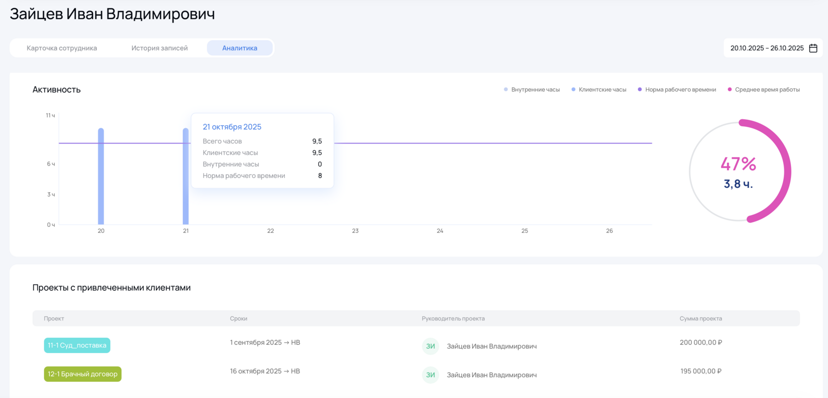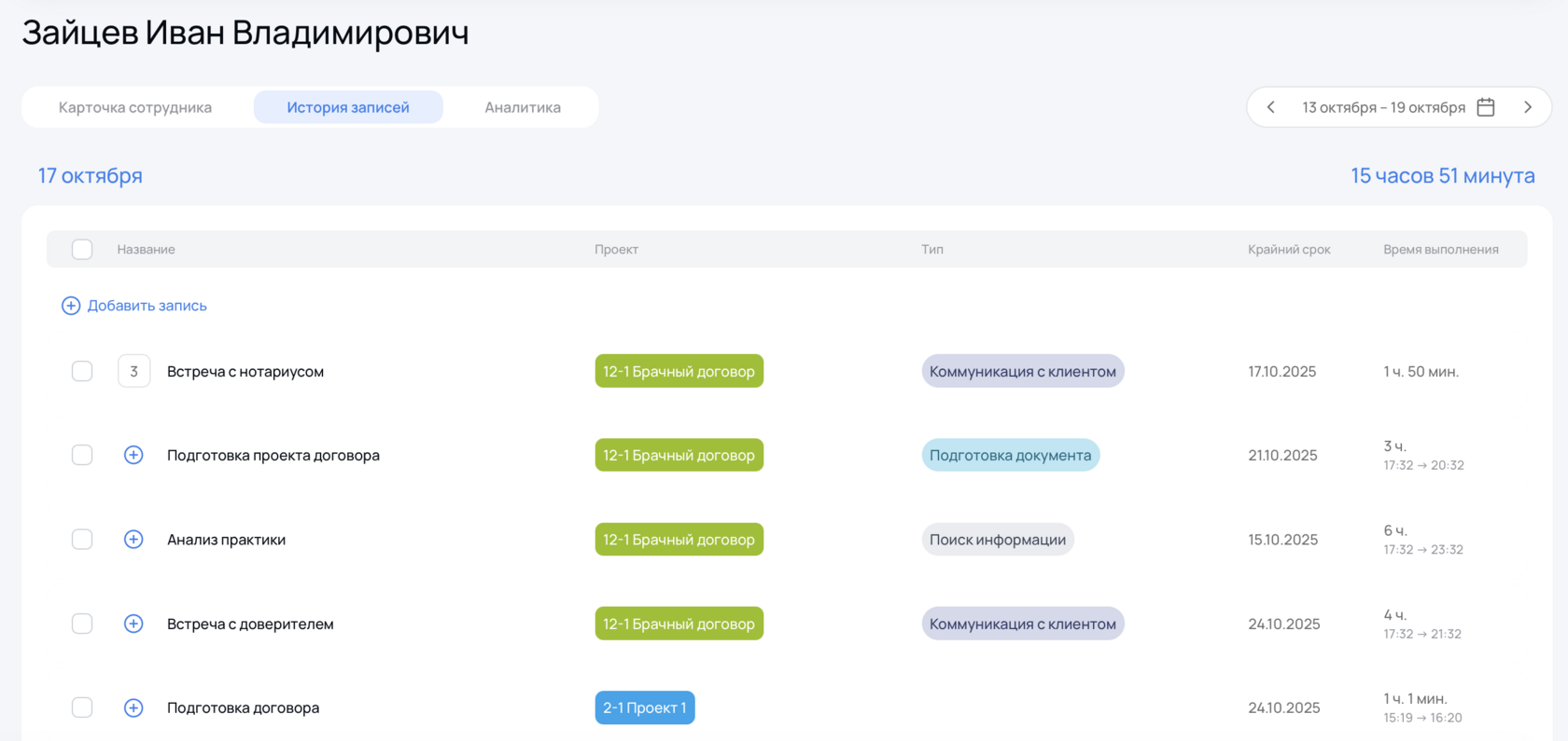Журнал всех задач сотрудника за любой период. Руководители видят, чем занимался юрист каждый день — полная прозрачность биллинга.