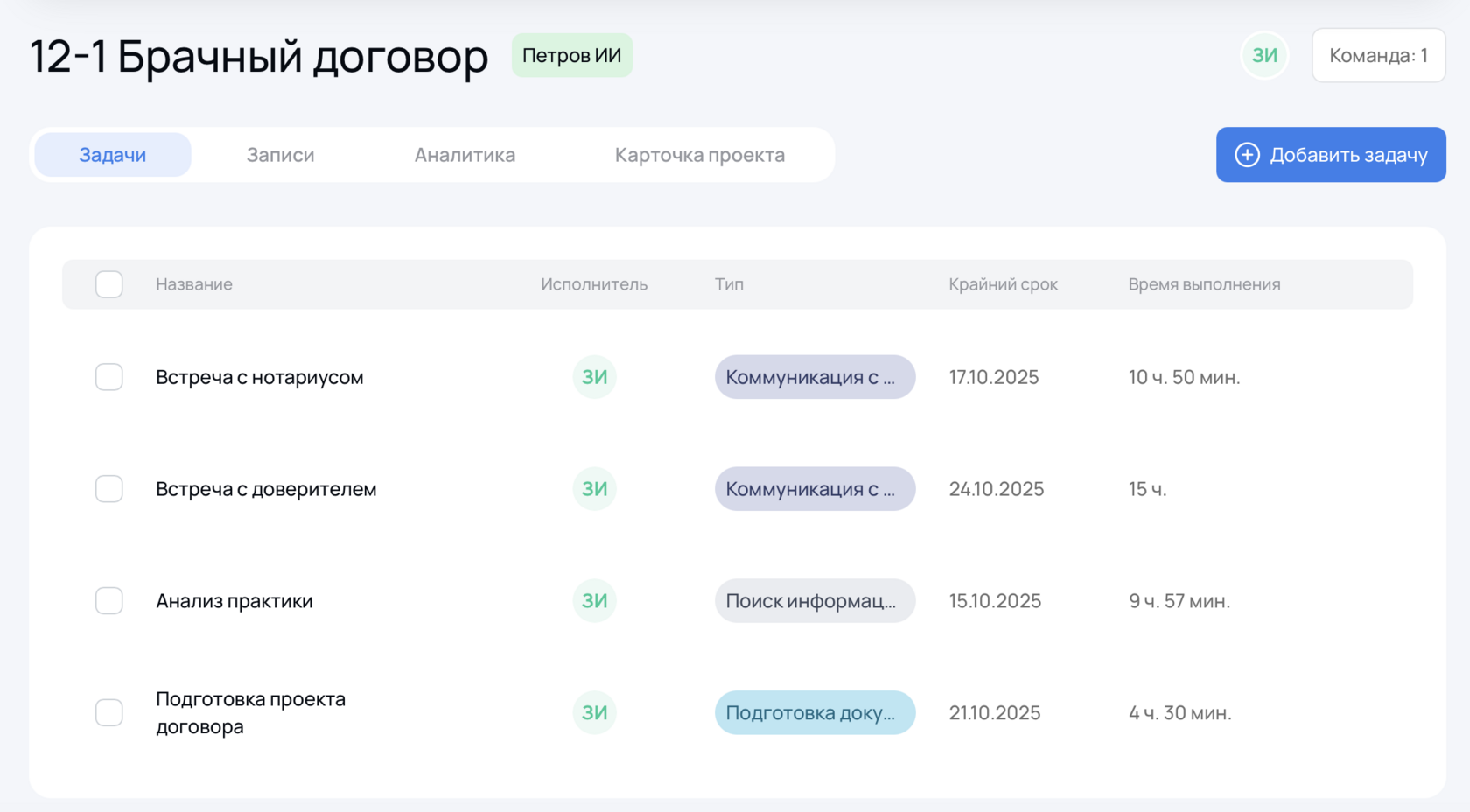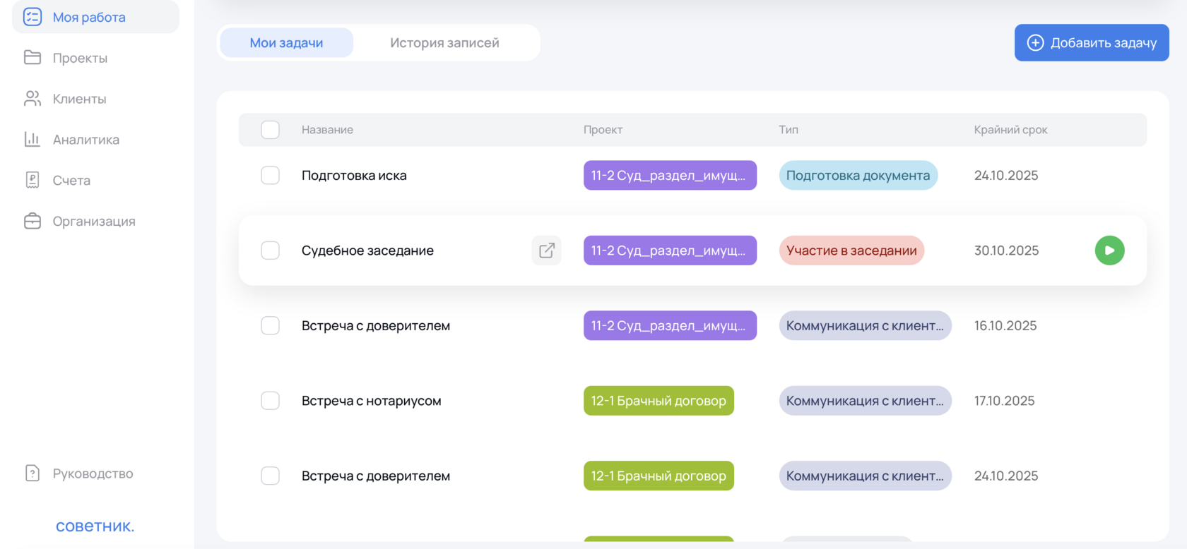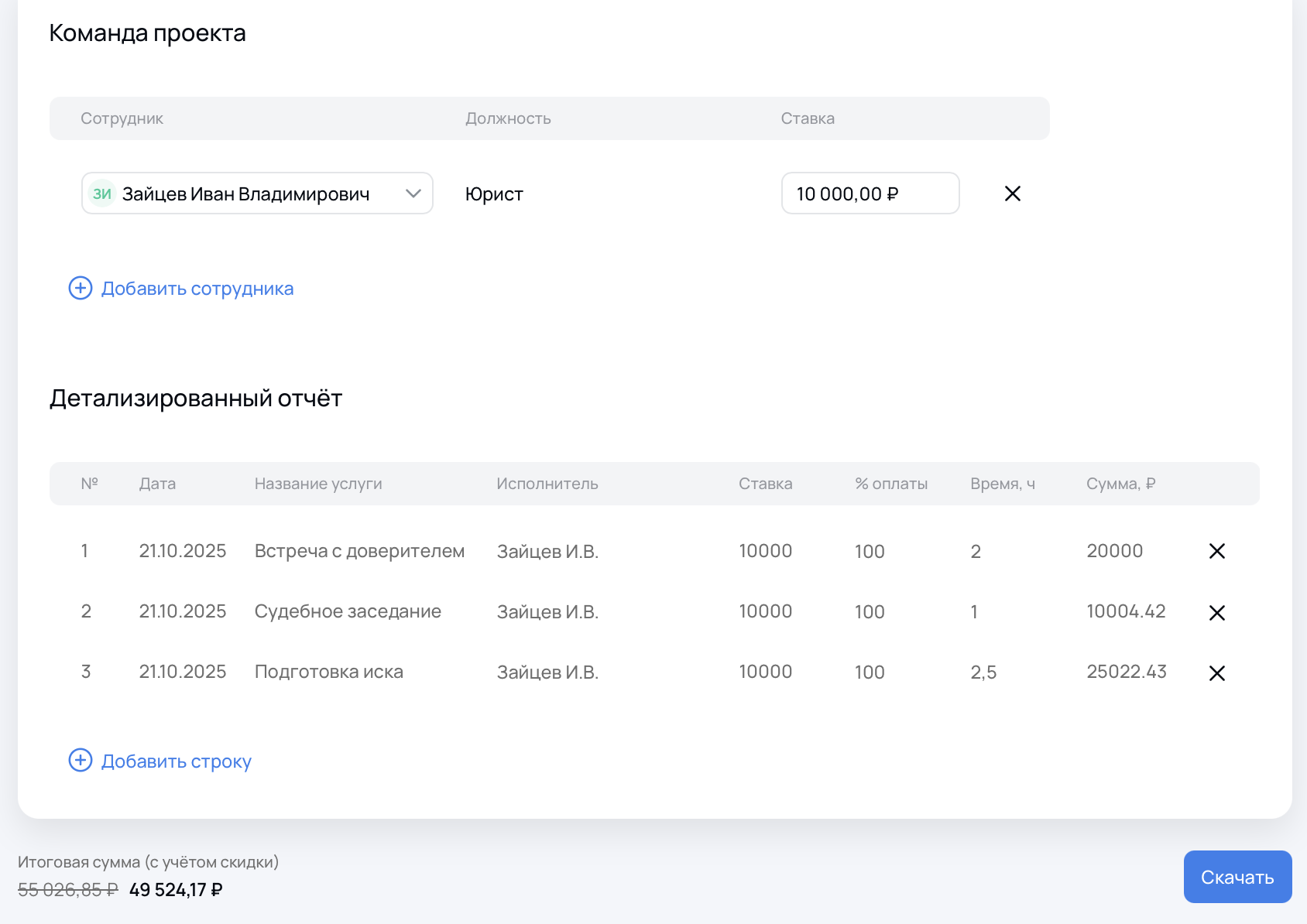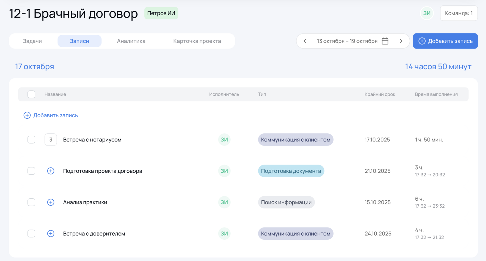 Журнал всех задач сотрудника за любой период. Руководители видят, чем занимался юрист каждый день — полная прозрачность биллинга.