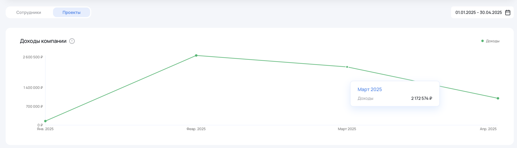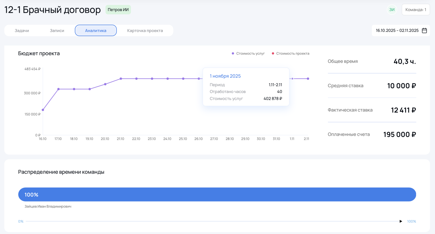 Финансовое здоровье проекта: выставленные счета, оплаченные суммы, забиленные часы и средняя ставка. Графики показывают динамику работы и помогают контролировать рентабельность.