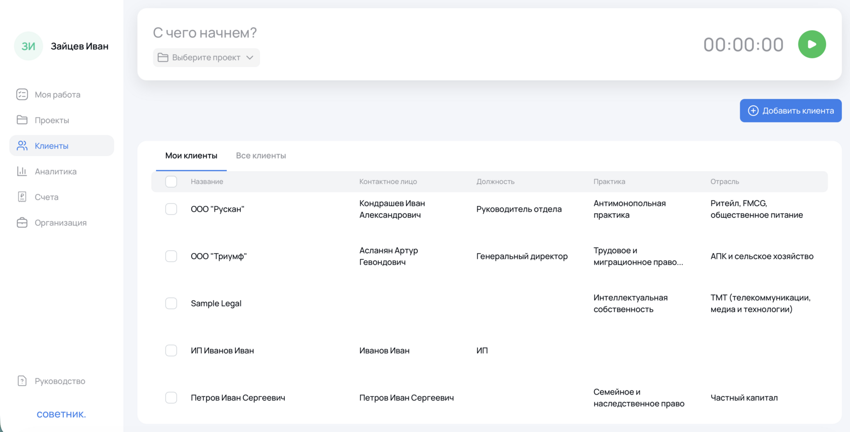 Полная информация: тип (юр./физ. лицо), реквизиты, отрасль, практика, контактные лица и ответственный сотрудник. Отслеживайте все проекты клиента, их стоимость и статусы на одном экране.