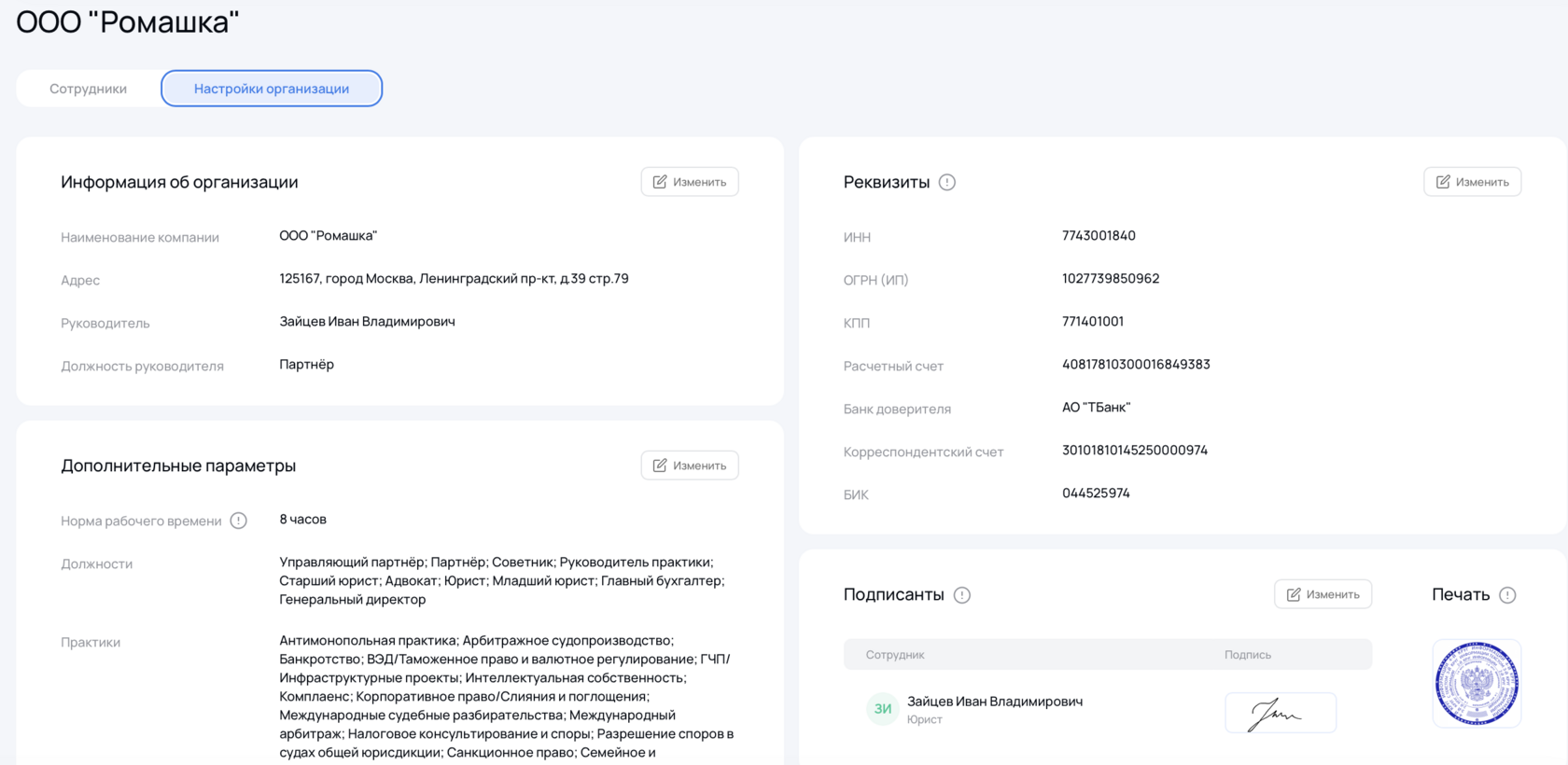 Реквизиты компании, подписанты, печать, норма рабочего времени. Настройте должности, практики, отрасли и типы задач под специфику вашей работы. Эти данные используются во всех документах и аналитике.