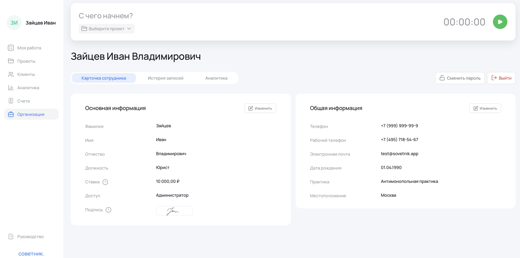 Контакты, должность, ставка, уровень доступа, загруженная подпись. Здесь же можно сменить пароль и выйти из аккаунта.