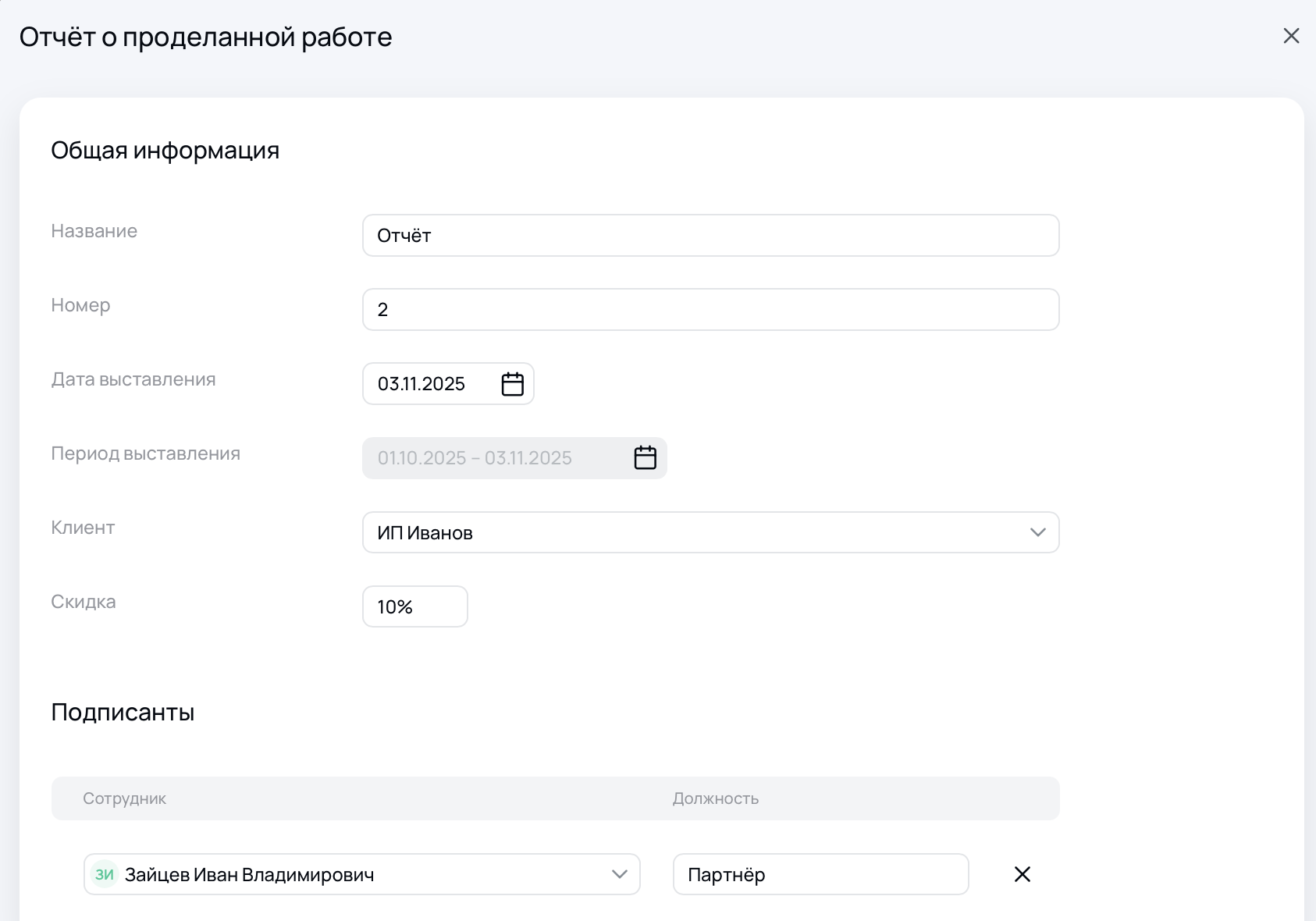 Автоматическое создание документов для клиентов. Формируйте счета, акты и детализированные отчёты за пару кликов — все реквизиты, подписи и печати подтягиваются из системы.