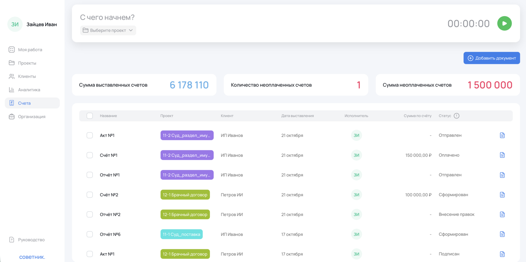 Ваша личная рабочая область и командный центр. Здесь вы контролируете свои задачи, запускаете таймер для учёта времени и управляете биллингом.