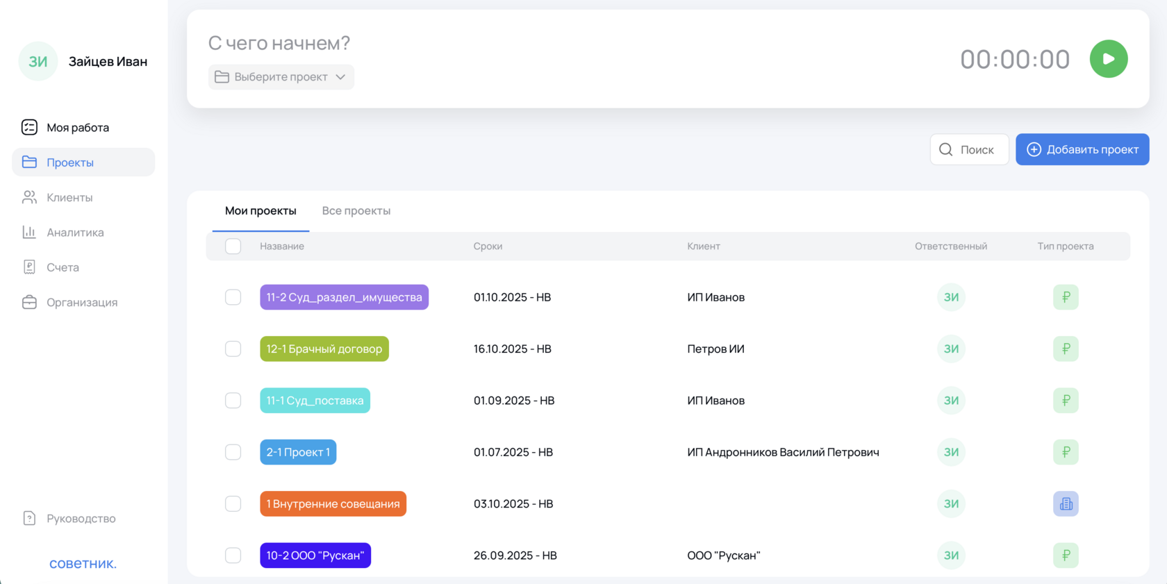 Проекты – база всех проектов, которые ведет ваша фирма, список задач по проектам и учтённому времени сотрудниками.