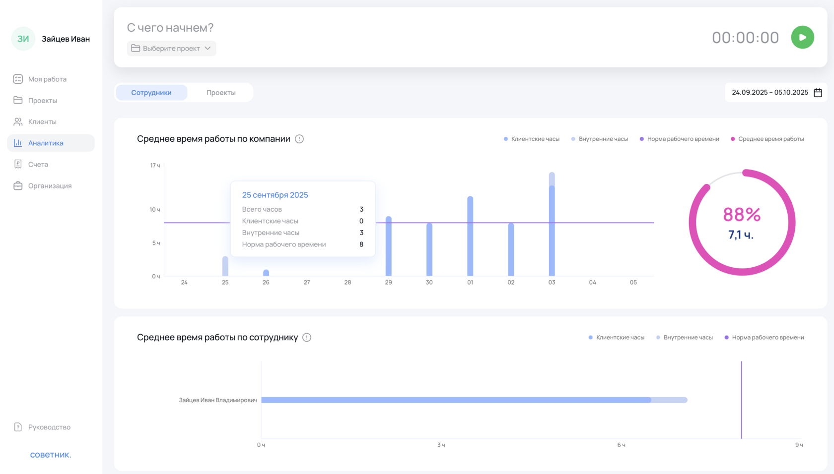 Личная статистика: соотношение клиентских и внутренних часов, загрузка относительно нормы, средняя ставка. Оценивайте эффективность и выявляйте перегрузку.