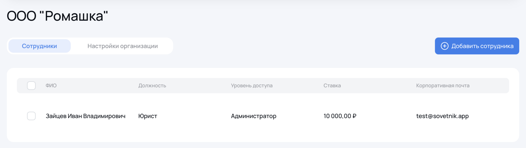 Пригласите команду — добавьте сотрудников через «Организация» → «Сотрудники»