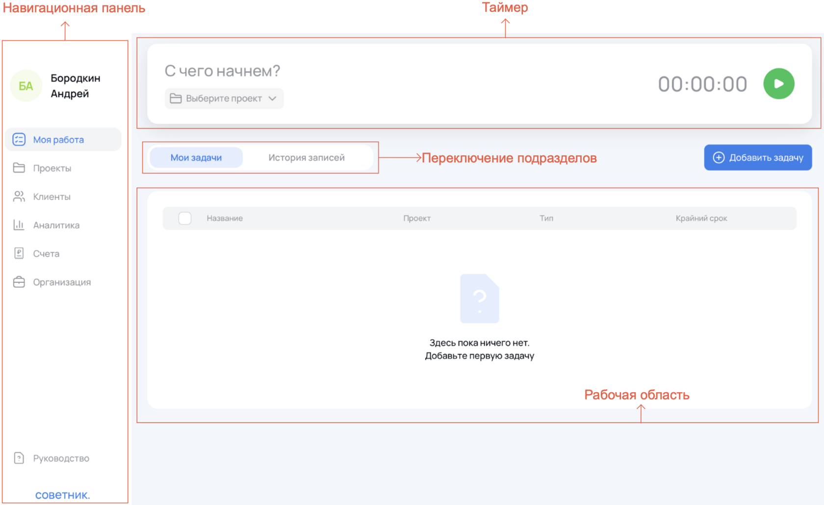 Вы узнаете, где находятся ваши задачи, как создавать проекты, добавлять клиентов, выставлять счета и анализировать работу фирмы. Мы последовательно разберём каждый раздел левой панели навигации и покажем, какие инструменты скрываются внутри.