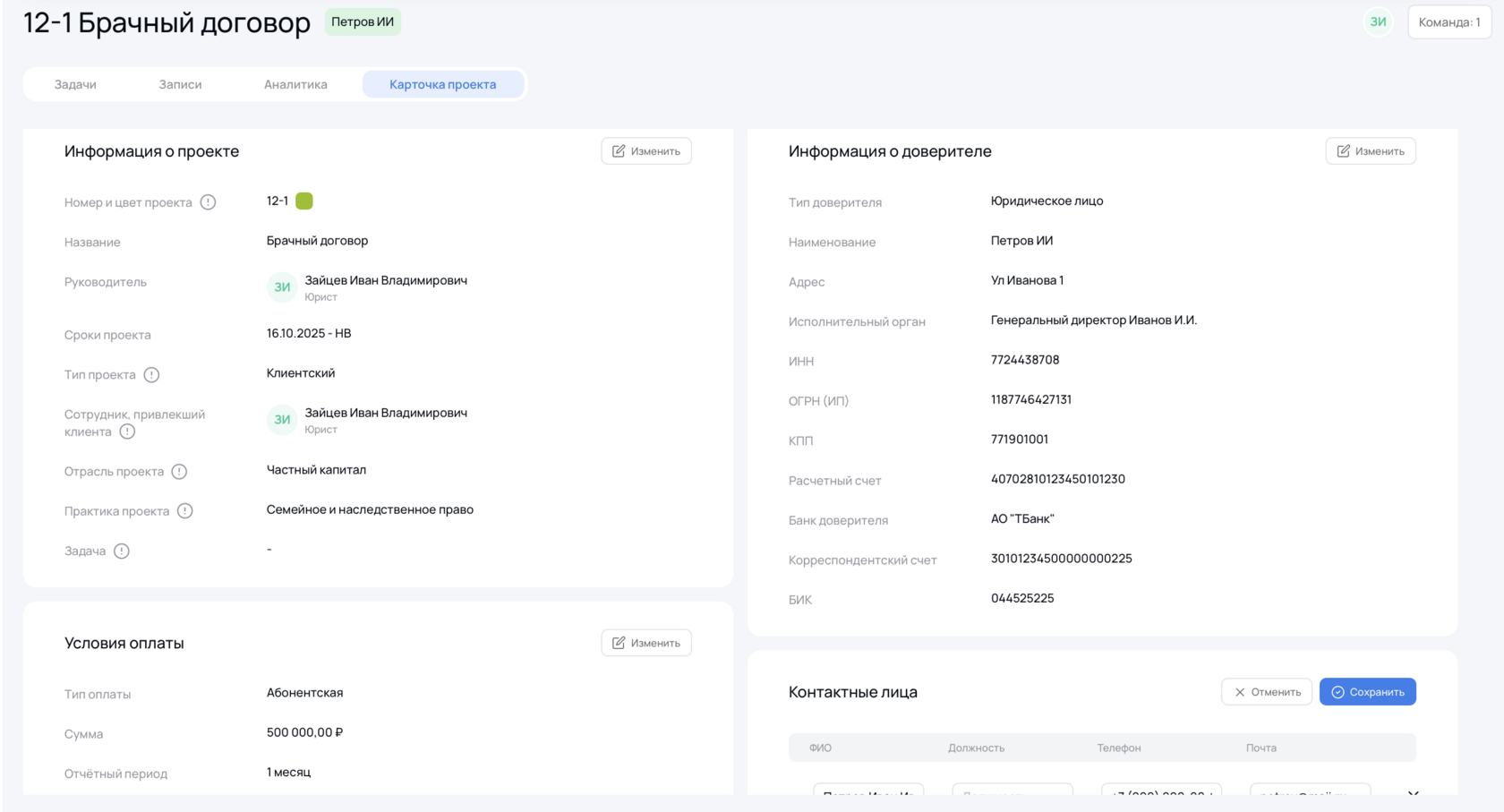 Паспорт проекта: условия оплаты (почасовая/фиксированная/абонентская), команда, сроки, практики, договоры и реквизиты клиента. Вся ключевая информация для управления делом.